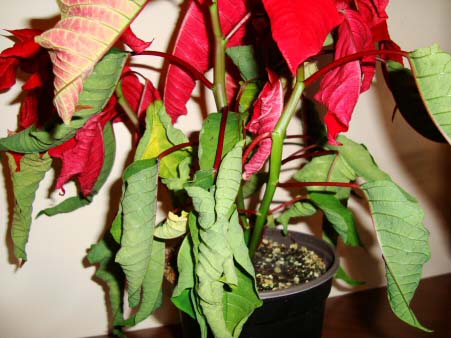 Poinsettia that has been overwatered, keeping the soil continually soggy.